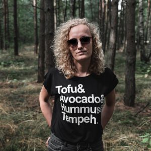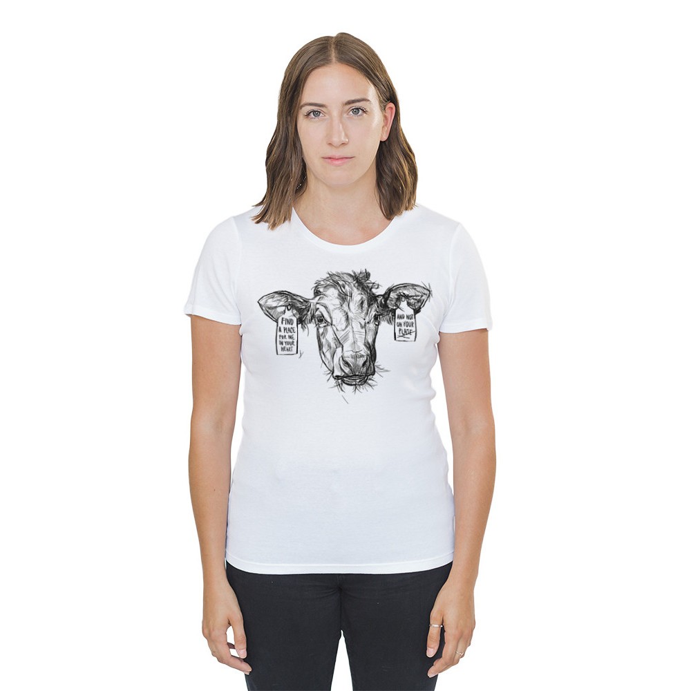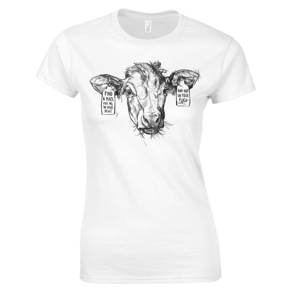 Koszulka ze zwierzętami hodowlanymi stanowi ciekawą odmianę dla nadruków standardowo spotykanych na t-shirtach. Na tej bluzce damskiej główną rolę odgrywa krowa z kolczykami w uszach, na których widnieje napis „Find a place for me in your heart and not on your plate”.