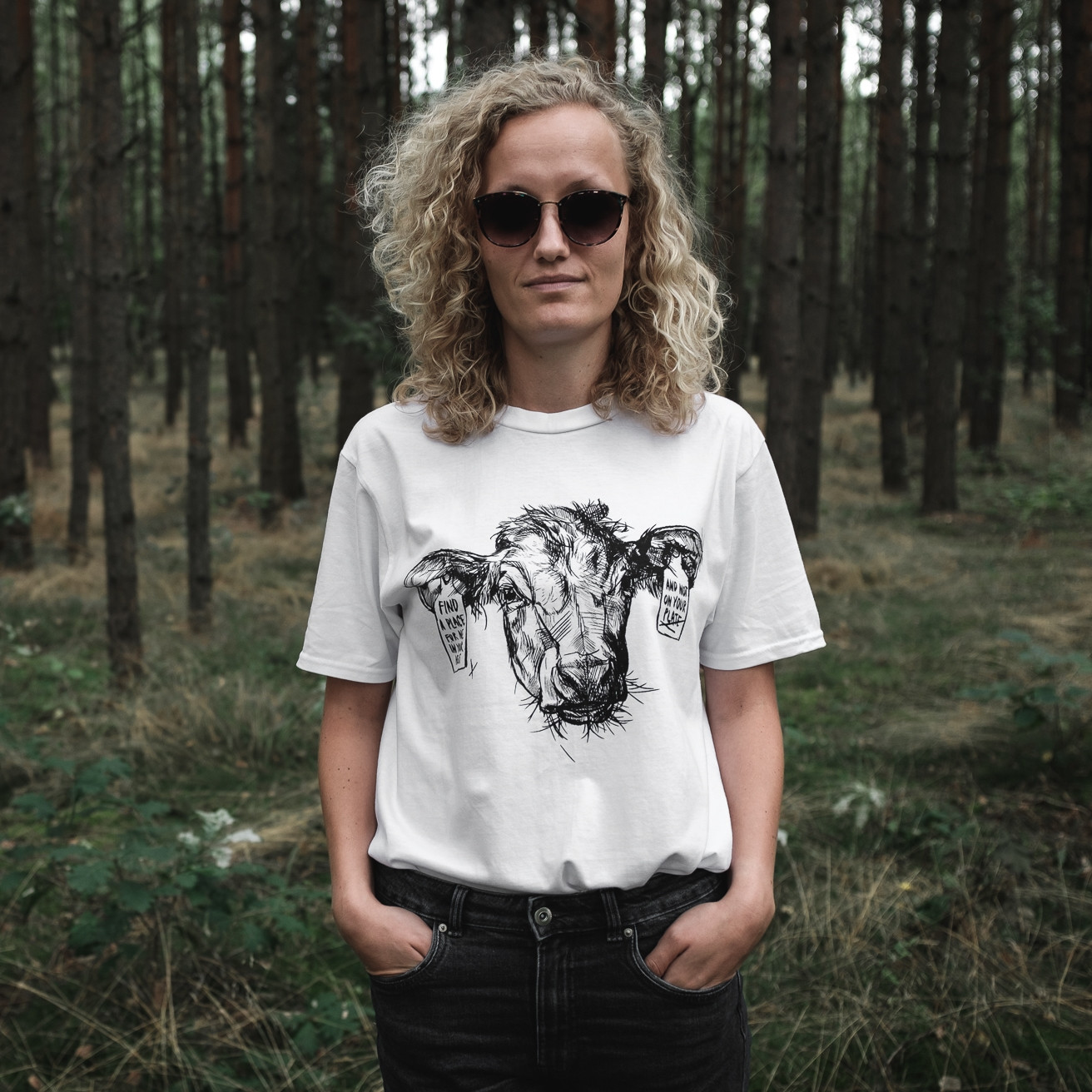 Kupując koszulki z twarzami zwierząt naszej produkcji dokładasz cegiełkę do ratowania życia kolejnych krówek, kur, lisów, norek i wielu innych stworzeń cierpiących na fermach w całej Europie.