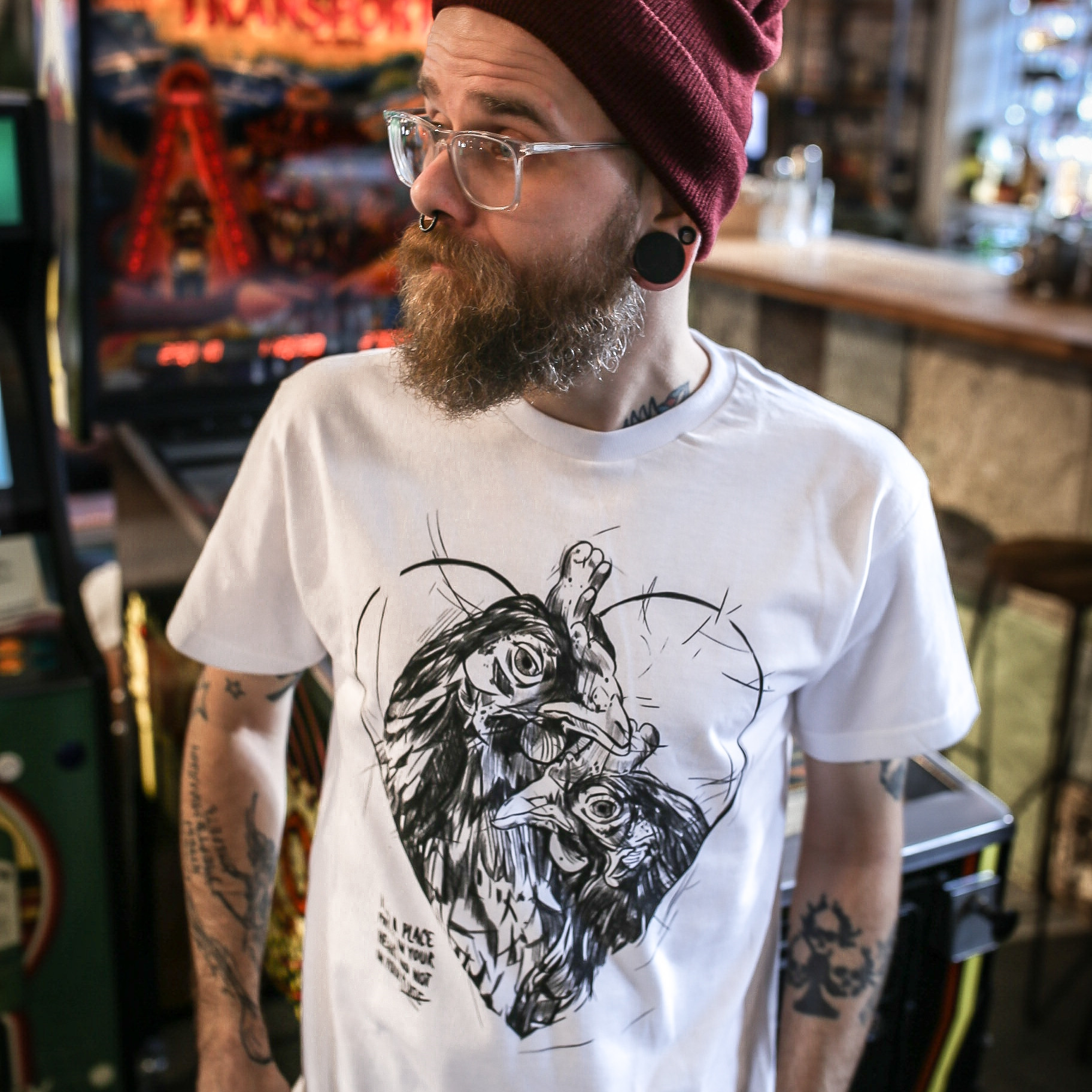 Prezentujemy koszulki męskie ze zwierzętami nie tylko dla wegan. Biały t-shirt Heart Hen zdobi duże serce, z którego nieśmiało wyglądają dwie kury. Zapewne uratowane przez Otwarte Klatki z fermy klatkowej, gdzie żyły w strasznych warunkach. Pod spodem widnieje niewielki napis “Find a place for me in your heart and not on your plate”. Kupując koszulki męskie ze zwierzętami w naszym sklepie wspierasz nadchodzące akcje ratownicze i dokładasz cegiełkę do uszczęśliwiania kolejnych zwierzaków.