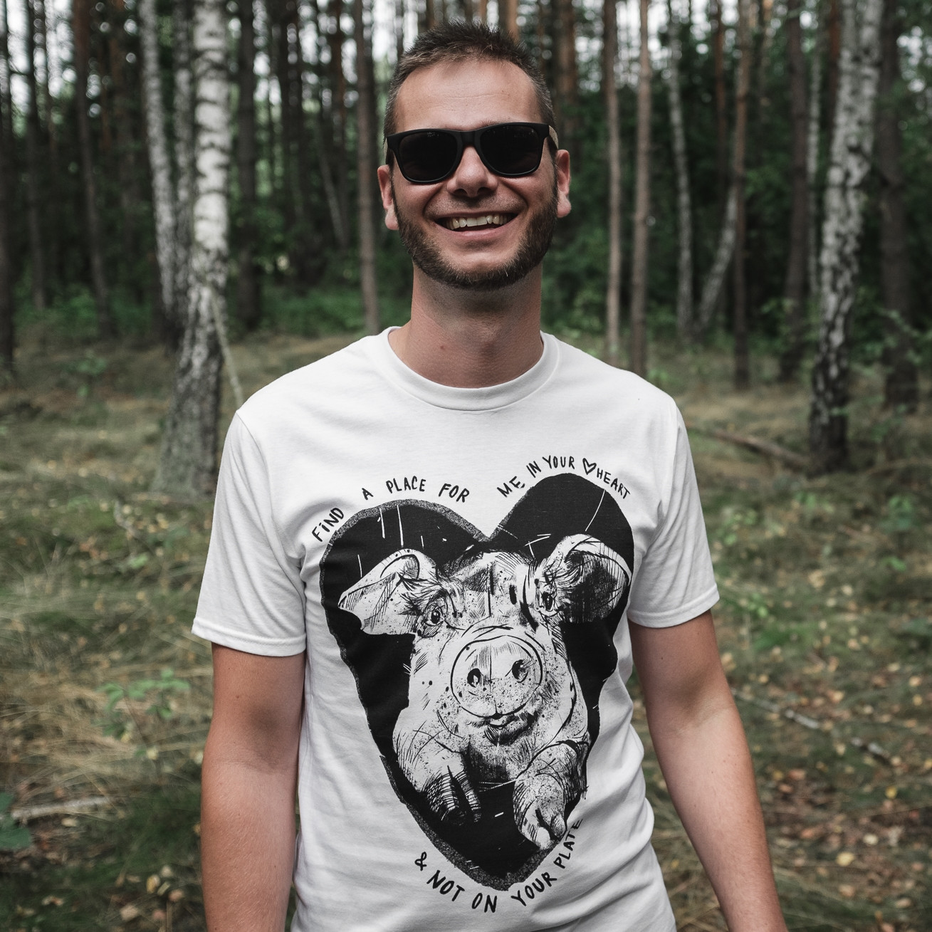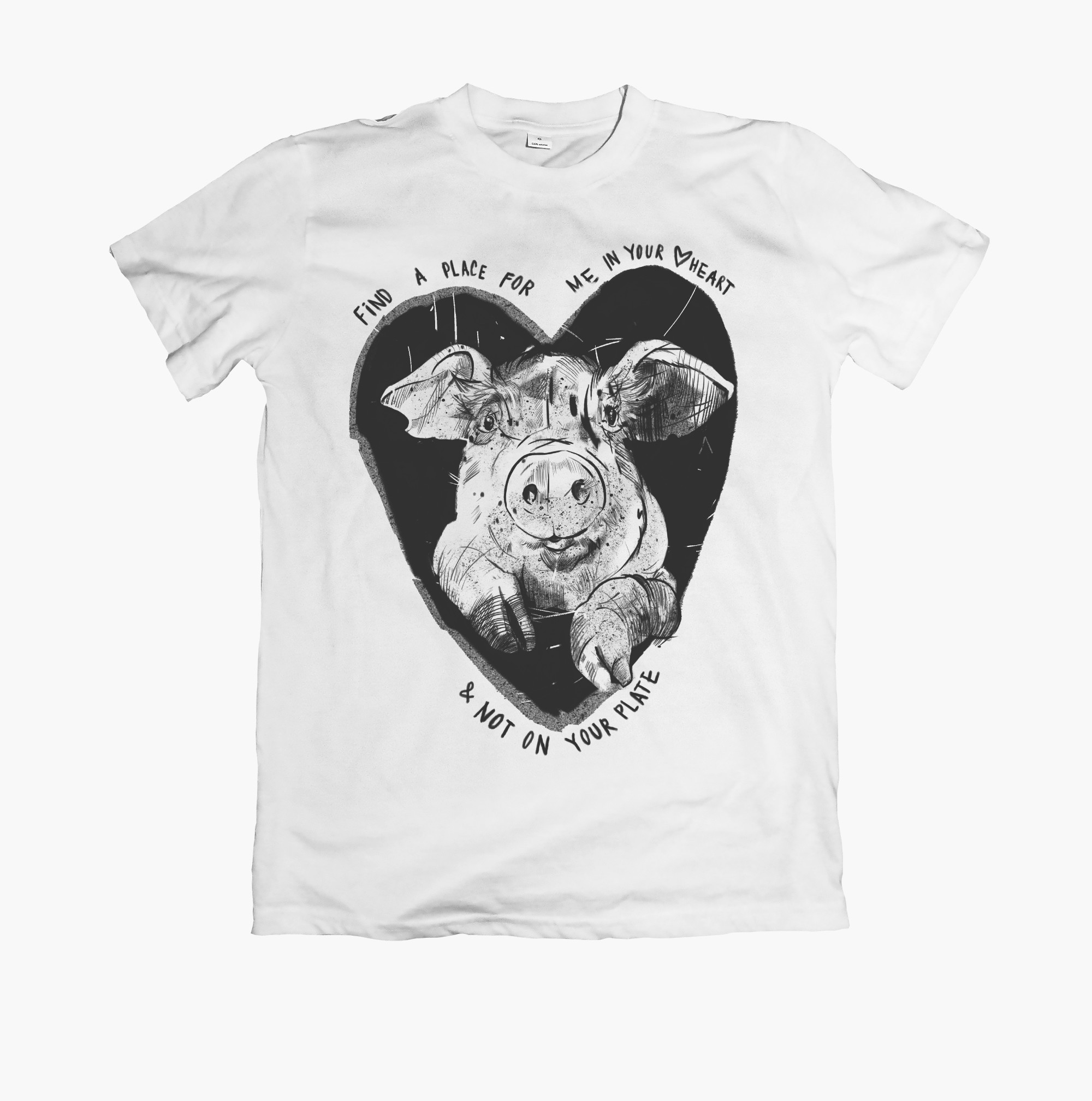 T-shirty ze zwierzętami hodowlanymi to niecodzienny widok. Biała koszulka Heart Pig stanowi przypomnienie, że każdy kawałek mięsa był kiedyś żywym stworzeniem. Urocza świnka leży otoczona dużym, czarnym sercem, dookoła którego widnieje napis “Find a place for me in your heart and not on your plate”.