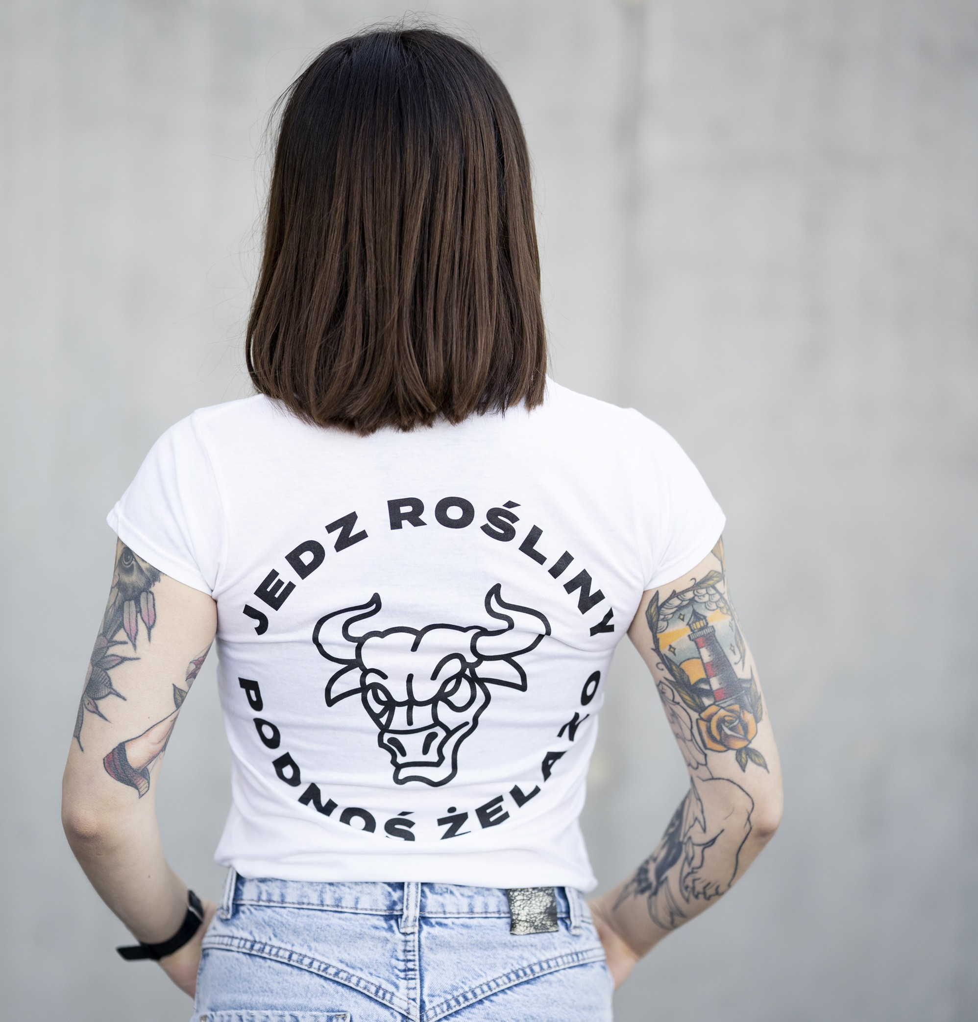 Koszulki z wege nadrukiem nie muszą być nudne. Kiedy założysz ten t-shirt, każda osoba idąca za Tobą na ulicy poczuje chęć przejścia na dietę roślinną. W wersji damskiej dostępna w kolorze białym z małym napisem na piersi “Jasna Strona Mocy”, a na plecach dużym rysunkiem głowy byka i hasłem “Jedz rośliny, podnoś żelazo”. W kategorii męskiej/unisex znajdziesz luźniejsze czarne koszulki z wege nadrukiem o tym samym przekazie, które równie dobrze wyglądają na kobietach.