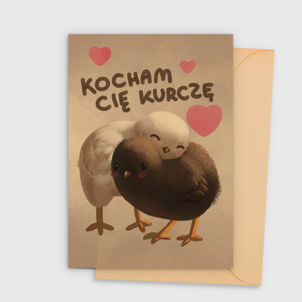 Słodka kartka pełna czułości! Dwa przytulone pisklaki i napis „Kocham Cię Kurczę” to doskonały sposób na wyrażenie miłości i sympatii – idealna na walentynki, rocznicę, Dzień Przyjaciela czy po prostu bez okazji. 💛💕