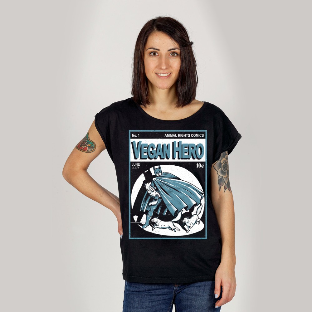 Łatwym sposobem na pokazanie, że nie jesz mięsa, będzie założenie koszulki wege ze sklepu Otwarte Klatki. Bluzka Vegan Hero Bat z superbohaterem ratującym lisa ma luźny krój idealny dla kobiet, które lubią czuć się swobodnie w każdej sytuacji. Wzór autorstwa Weroniki Kolińskiej nawiązuje do postaci z komiksów.