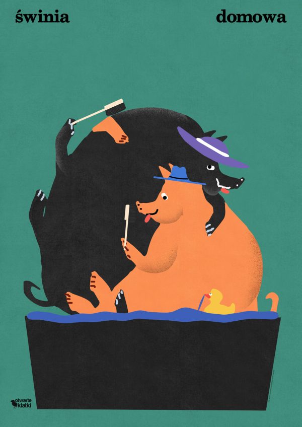 W sklepie Otwarte Klatki znajdziesz oryginalne plakaty do salonu prezentujące zwierzęta, o których prawa walczymy na co dzień. Uważasz, że świnie to przyjaciele, nie jedzenie? Plakat Świnia Domowa będzie idealnie pasował do twojego salonu, przedpokoju czy innego pomieszczenia. Na ilustracji autorstwa Jakuba Zasady widzimy czarną i pomarańczową świnkę, które oddają się uciechom wspólnej kąpieli. Oryginalne plakaty do salonu z innymi zwierzakami znajdziesz w odpowiedniej kategorii w sklepie.