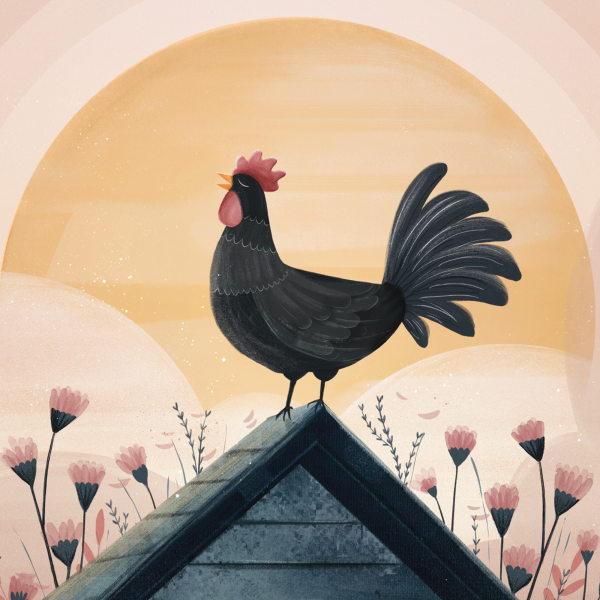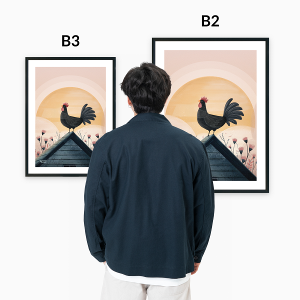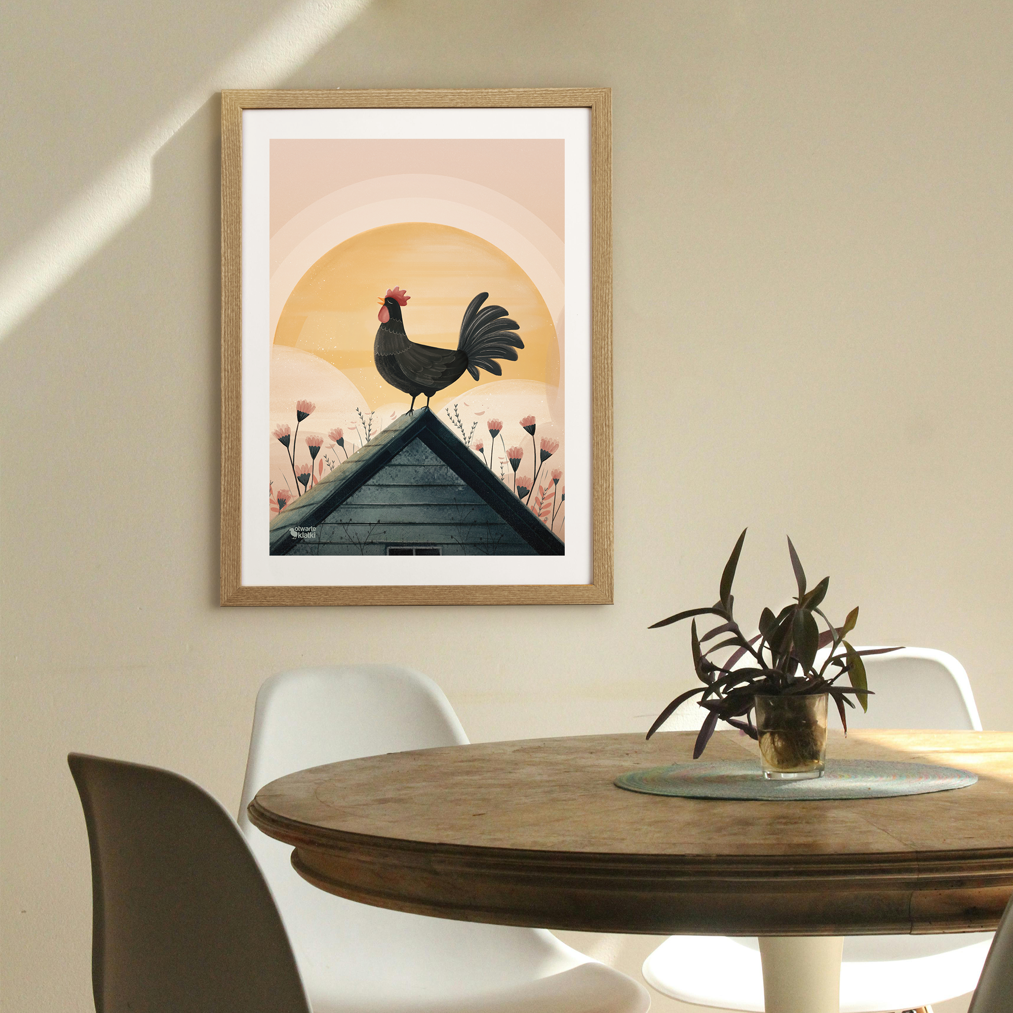 Dumny kogut na dachu, słońce wstaje, a świat budzi się do życia! Ten energetyczny plakat wniesie do Twojej przestrzeni odrobinę wiejskiego klimatu i przypomni, że każde zwierzę ma swoje miejsce na świecie.
