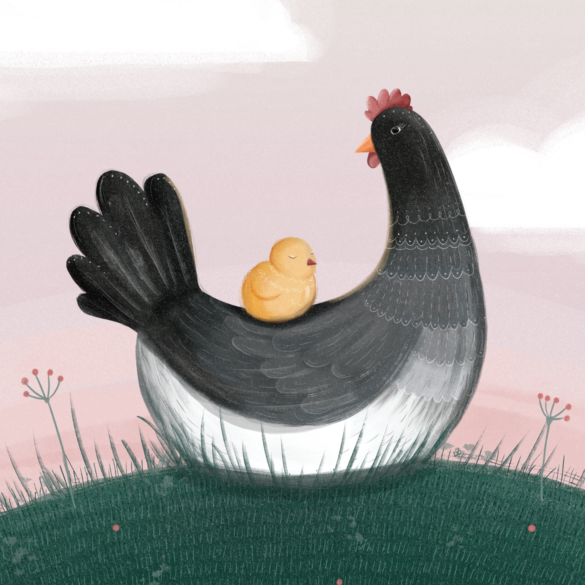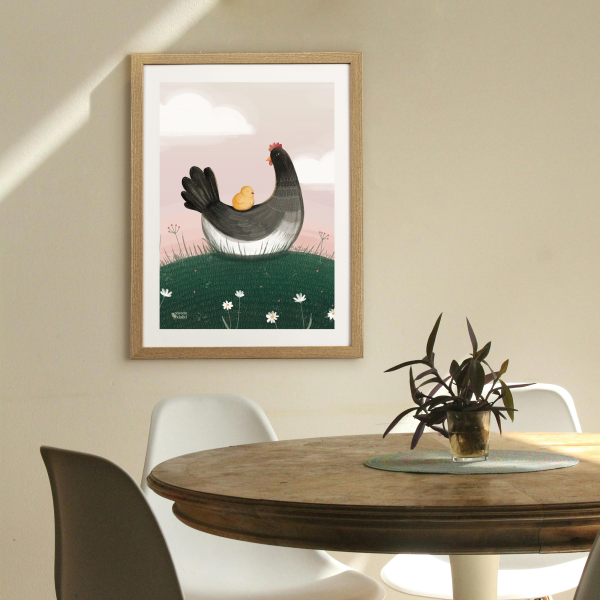 Mama kura z pisklakiem na grzbiecie – czułość i troska w najczystszej postaci! Ten uroczy plakat to hołd dla macierzyństwa i naturalnych więzi, które powinniśmy szanować u wszystkich zwierząt. Idealny do kuchni, pokoju dziecięcego lub jako czuły akcent w Twoim domu.