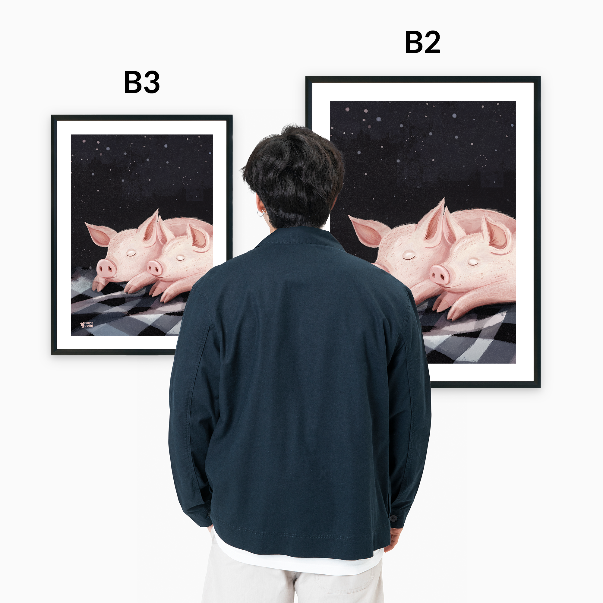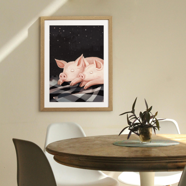 Dwa śpiące prosiaczki pod nocnym niebem – absolutna esencja spokoju i beztroski. Ten plakat otula ciepłem i przypomina, że każde zwierzę zasługuje na bezpieczeństwo i spokojny sen. Idealny do sypialni lub miejsca, w którym chcesz poczuć ukojenie.