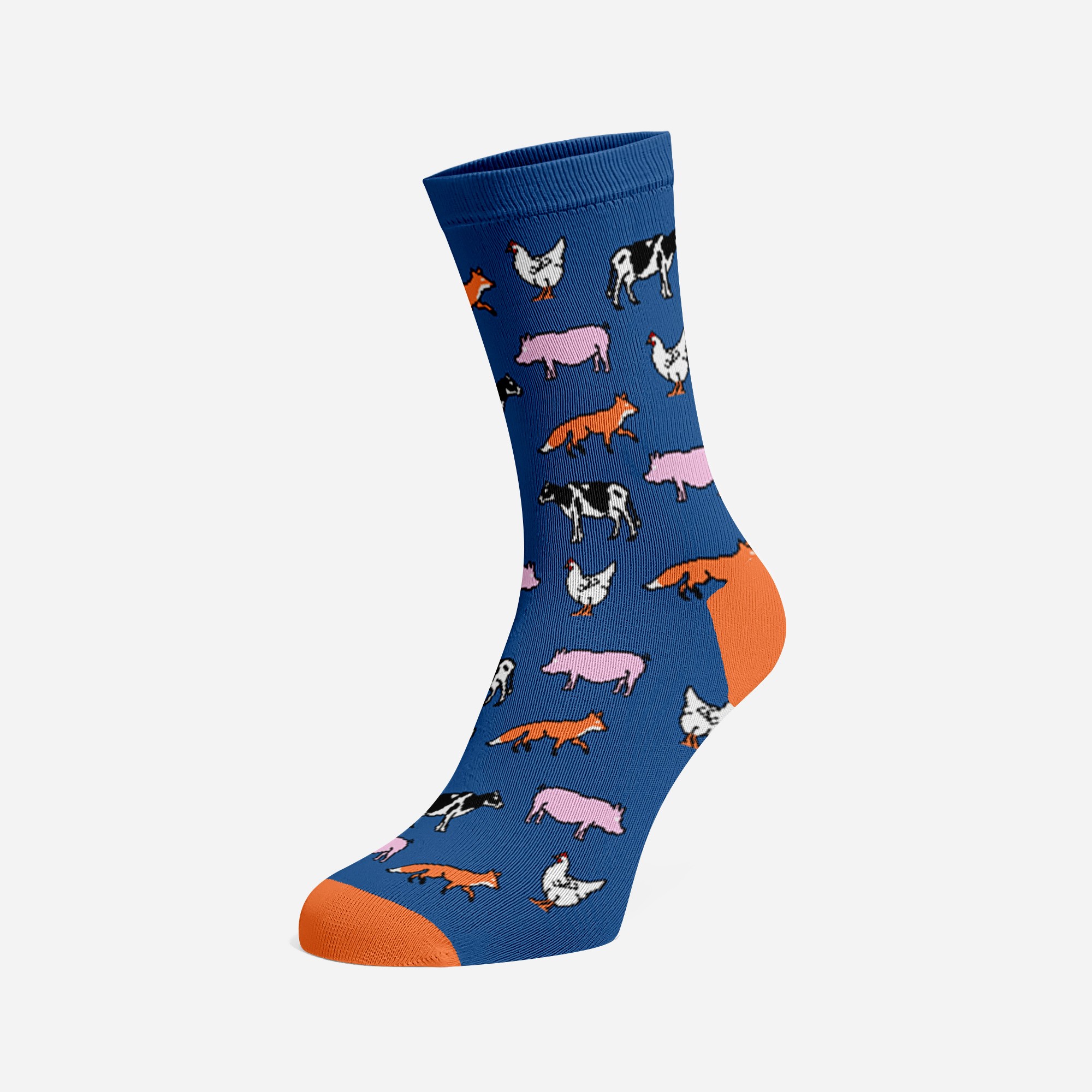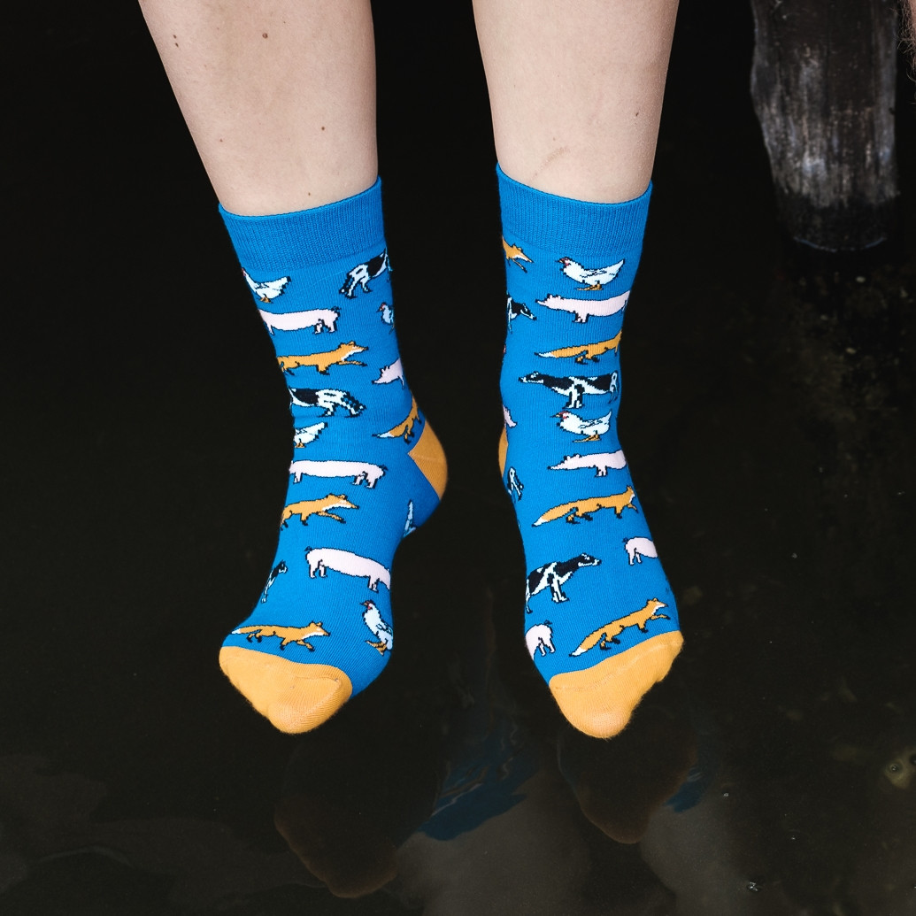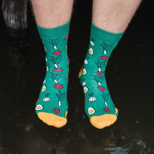 Ciemnozielone skarpetki z różnymi warzywami. Na skarpetce znajdują się: awokado, pomidor, cebula, marchewka i por.