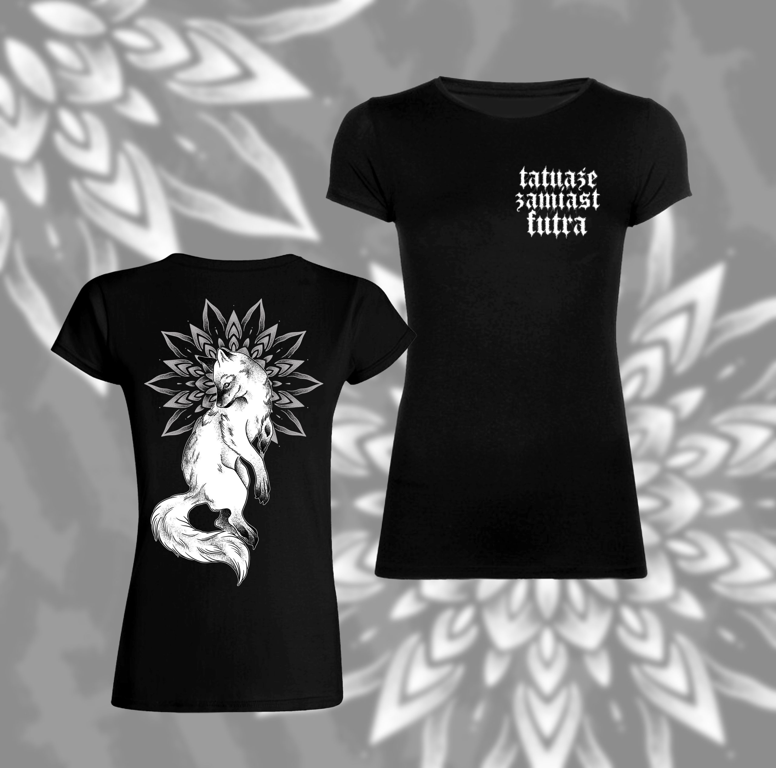 Tatuaż i koszulka damska ze sklepu Otwarte Klatki to idealny zestaw zamiast futra. Powie Ci to każde zwierzę futerkowe, którego życie uratowaliśmy i uratujemy, również dzięki zakupionym u nas ubraniom. Czarna koszulka z napisem “Tatuaże zamiast futra” z przodu oraz podobizną lisa na plecach poleca się dla wszystkich fanek nietypowych ozdób.