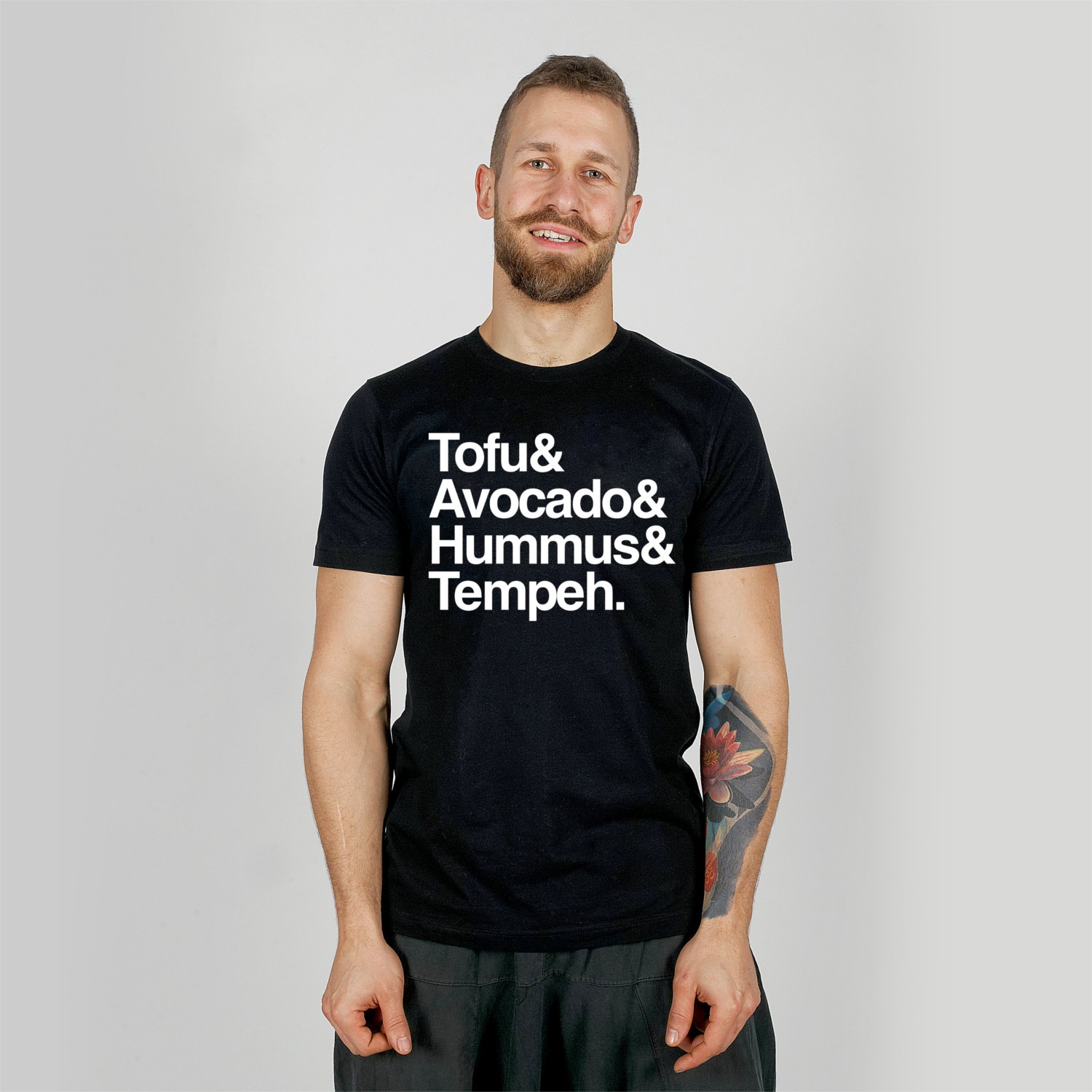 Stawiasz na wegańskie ubrania? Mamy coś dla prawdziwych fanów kuchni roślinnej. Koszulka z napisem Tofu&Avocado&Hummus&Tempeh wzorowana na popularnych t-shirtach zespołu The Beatles. Prosty fason i czarny kolor sprawiają, że wygląda świetnie nie tylko na mężczyznach, ale też kobietach. Większość naszych wegańskich ubrań z działu męskiego to modele unisex. Koszulka idealna dla miłośników roślinnych klasyków, a każda sprzedana sztuka wspiera Otwarte Klatki.
