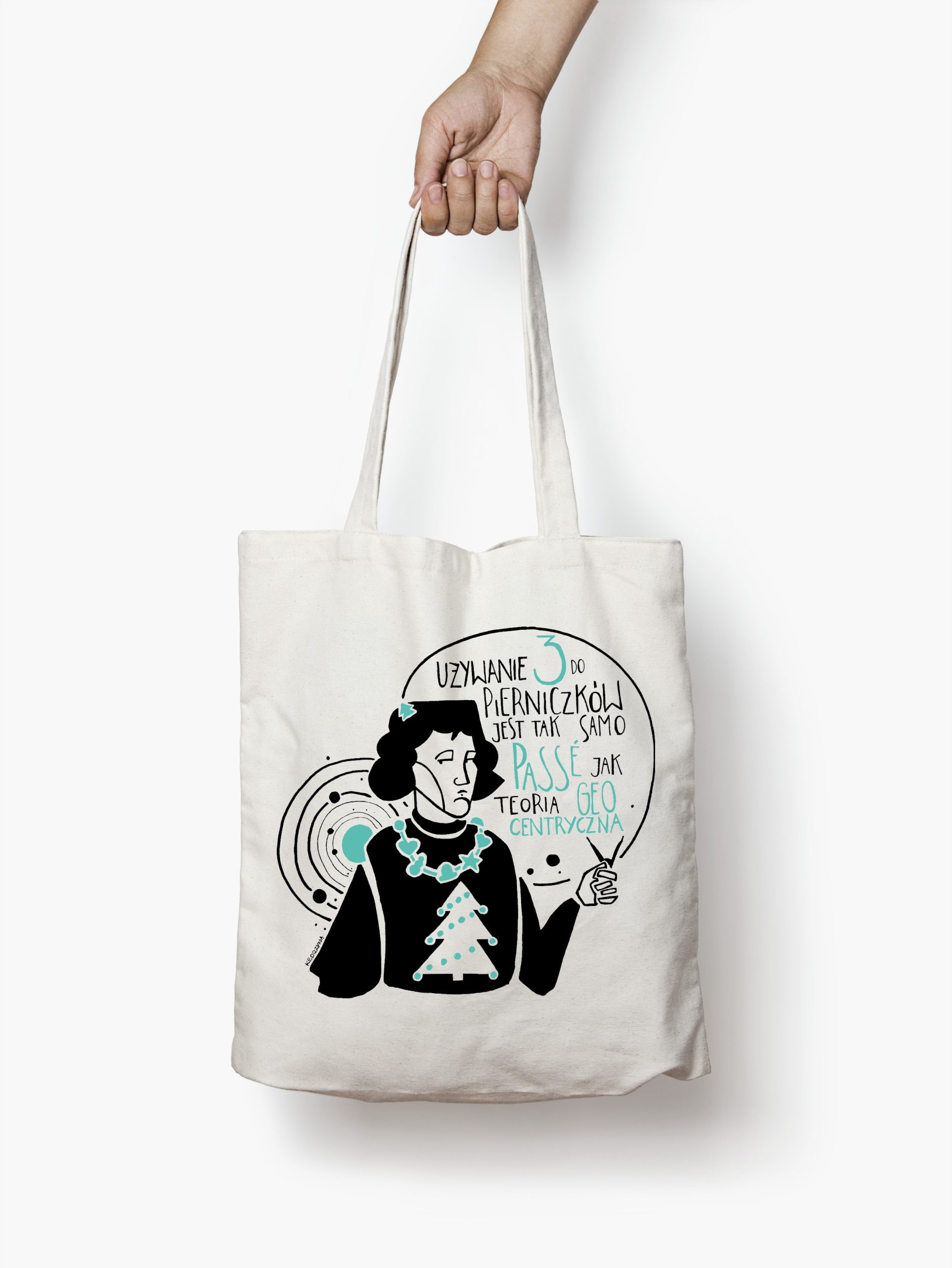Mikołaj Kopernik obalił teorię geocentryczną, a torby materiałowe na ramię z jego podobizną mają pomóc w obaleniu chowu klatkowego. Kup jedną z nich i dołóż grosz na działania Stowarzyszenia Otwarte Klatki. W serii toreb materiałowych na ramię z podobiznami znanych naukowców i naukowczyń każde z nich ma do przekazania ważne zdanie. Mikołaj Kopernik twierdzi, że “Używanie 3 do pierniczków jest tak samo passé jak teoria geocentryczna”. Warto go posłuchać i zrezygnować z kupowania jajek “trójek” pochodzących z chowu klatkowego, a na zakupy zawsze zabierać jedną z naszych toreb.