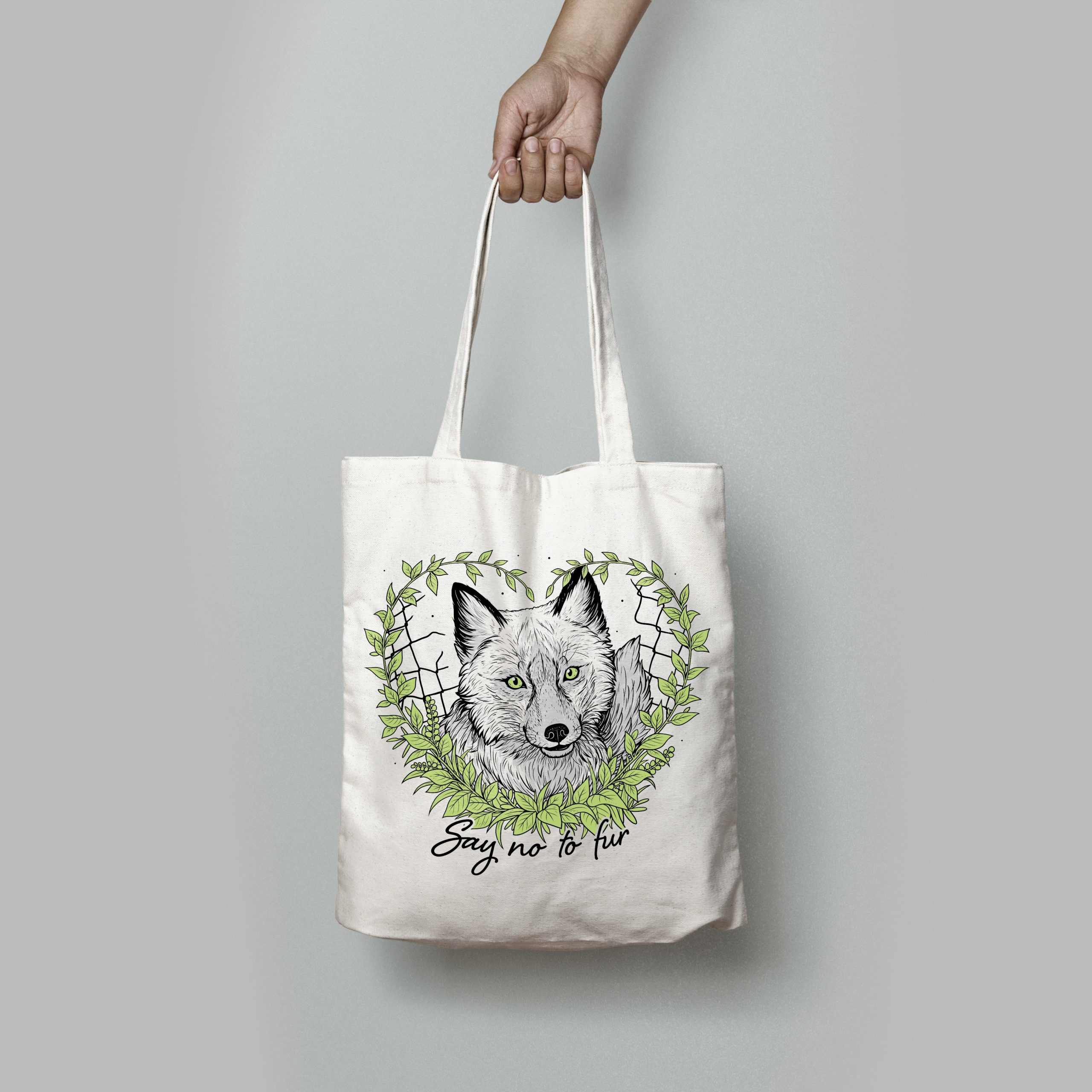 Bawełniana torba w kolorze naturalnym z wizerunkiem lisa, motywem roślinnym i napisem „Say no to fur”
