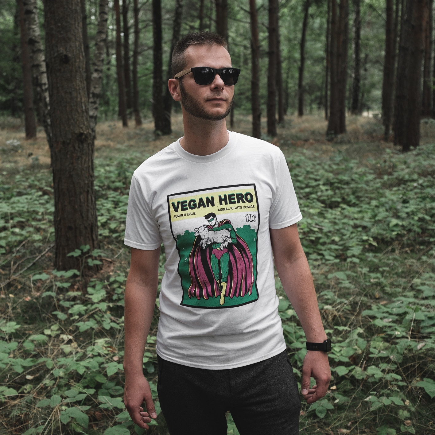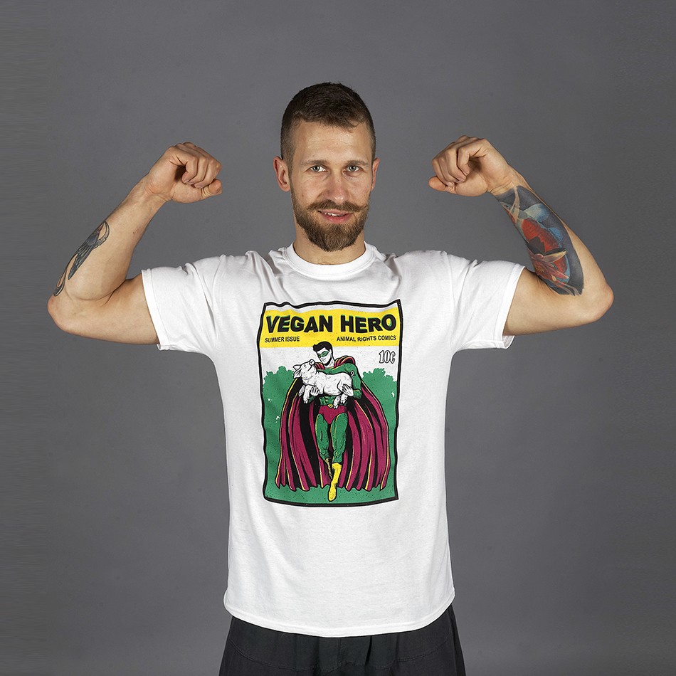 Jak rozpoznać na ulicy weganina? Z pewnością po koszulce “Vegan Hero Super” ze sklepu Otwarte Klatki. Przód zdobi komiksowy wizerunek superbohatera w pelerynie ratującego ucieszoną świnkę. Wzór stworzony przez Weronikę Kotlińską świetnie prezentuje się na białym tle. W naszym sklepie znajdziesz też koszulki z innymi superbohaterami w czarnym kolorze. T-shirt “Vegan Hero Super” jest uwielbiany przez osoby na diecie roślinnej, ale także fanów i fanki komiksów.